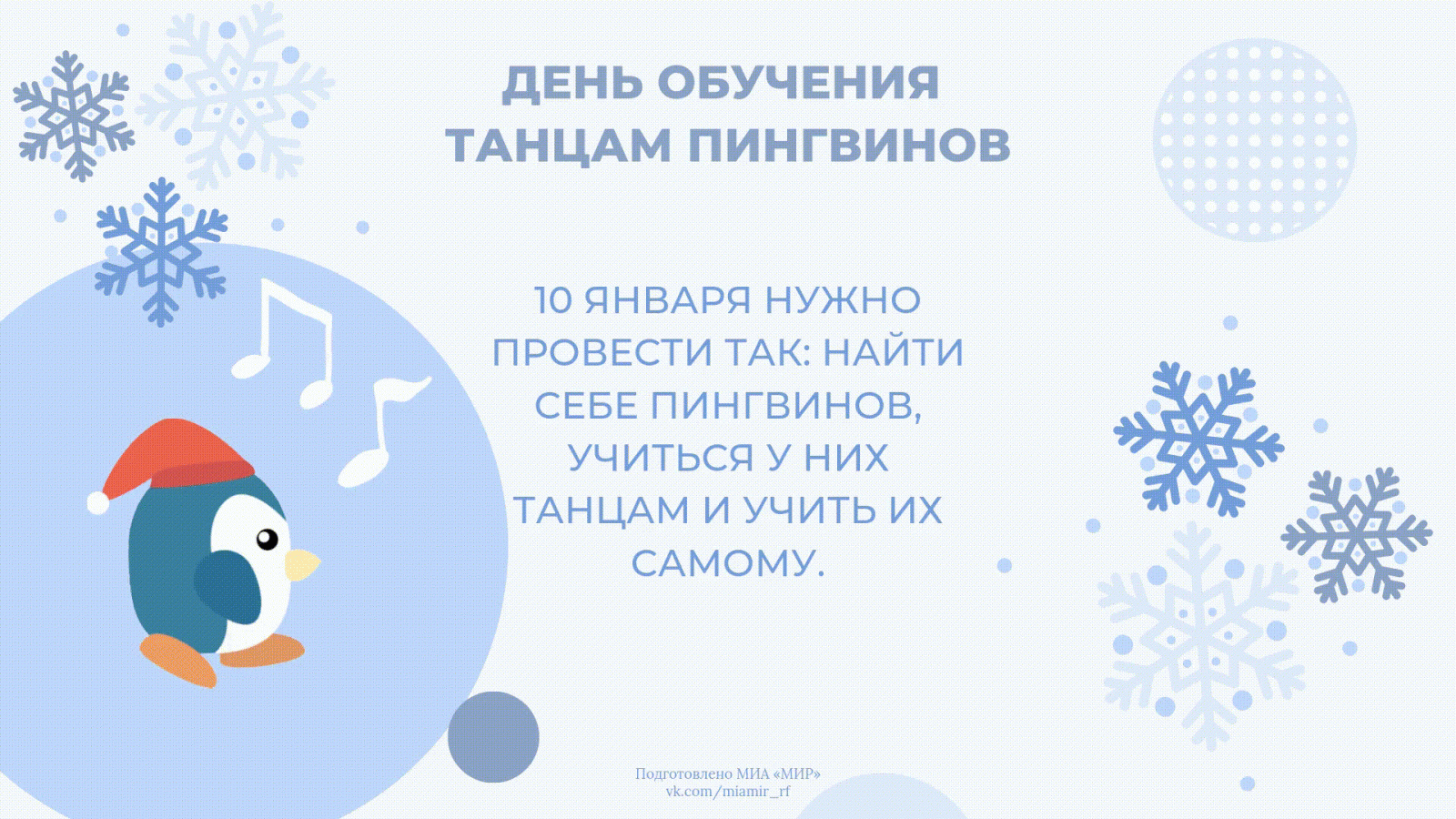 10 января — Молодежные новости. 10 января необходимо провести в компании морских птиц в элегантных фраках, ну, или хотя бы танцуя, потому что отмечается удивительный День обучения танцам пингвинов.