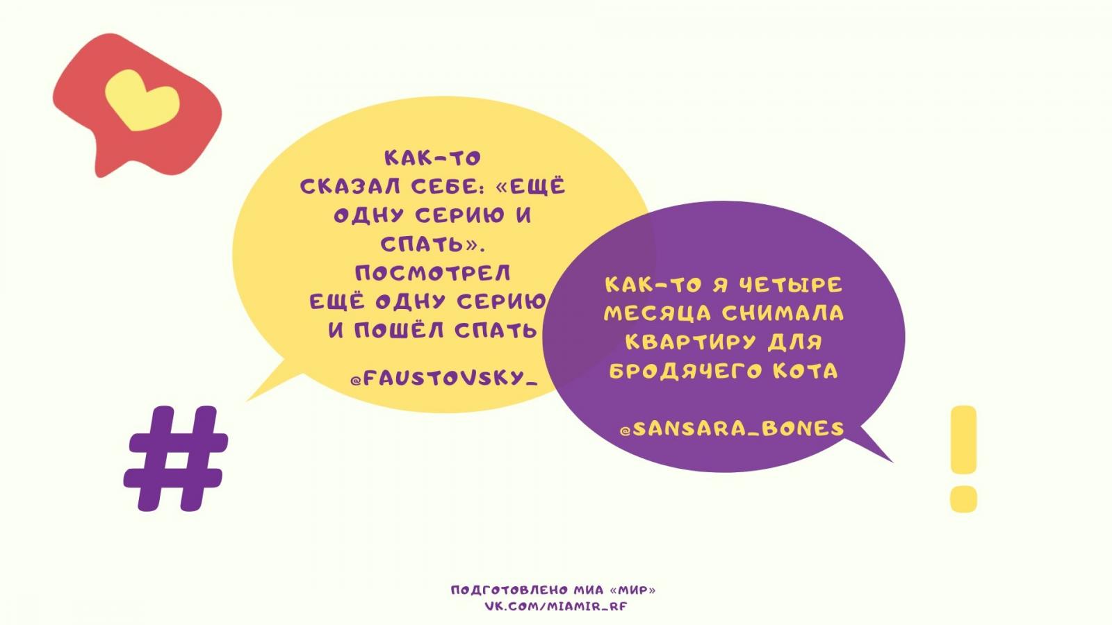 12 января — Молодежные новости. На просторах Twitter пользователь с ником @turbojedi запустил флешмоб, в котором могут участвовать все желающие. Задача: рассказать правдивую историю, которая звучит, как выдумка. Под твитом уже собралось более 1000 историй, в которых люди делятся своим опытом съема квартиры для бродячего кота, рассказывают, как потеряли знаменитость в лесу, хвалятся фотографиями котика, которую прислал известный писатель.