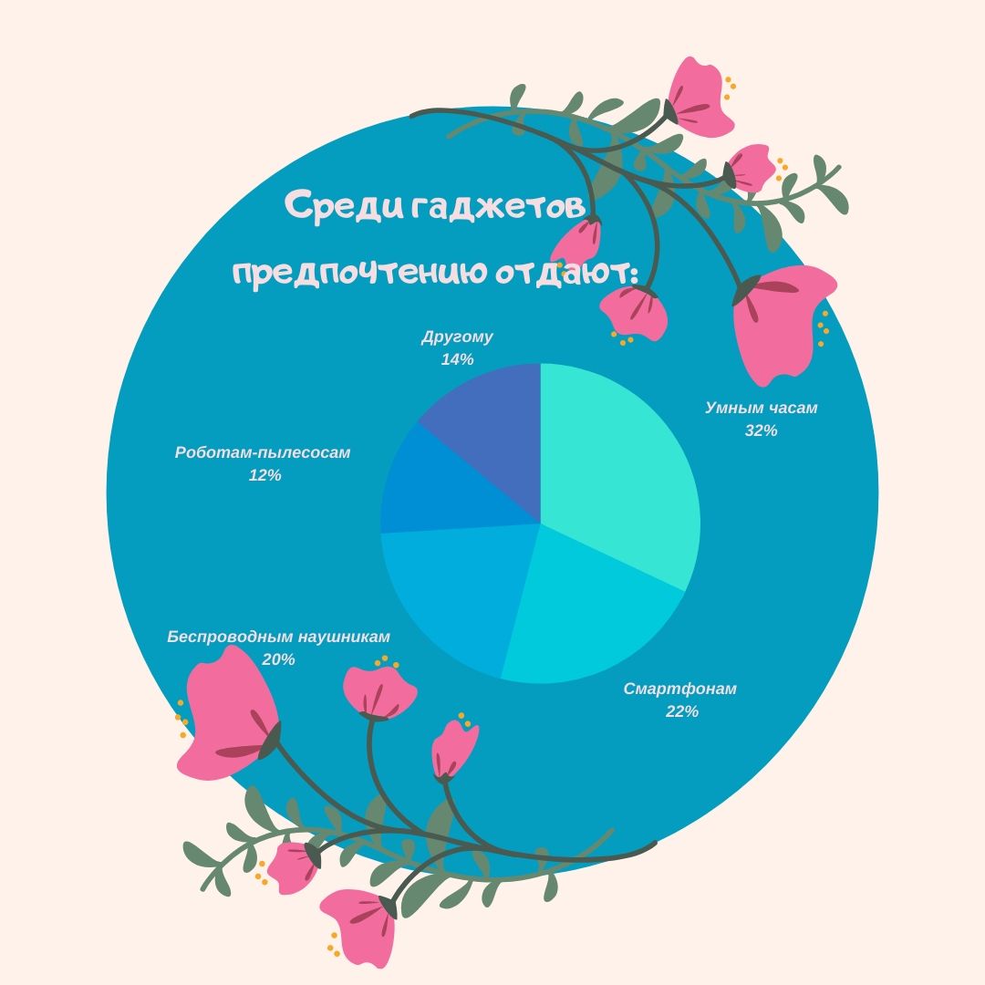 Среди самых популярных подарков в 2020 году также оказались гаджеты. Большинство отдает предпочтение фитнес-браслетам и умным часам. Смартфоны и беспроводные наушники также часто становятся подарком на 8 марта с минимальным отрывом друг от друга.