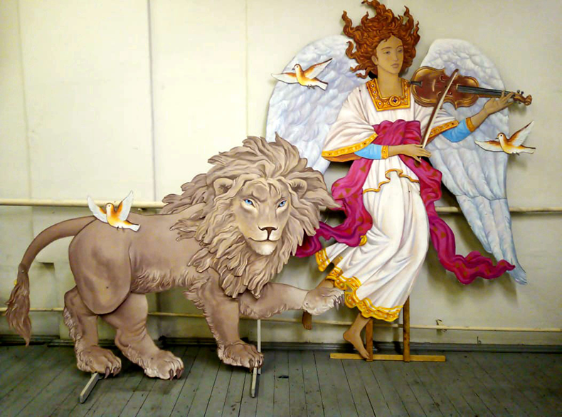 На инсталляции изображены рождественский Ангел - музыкант, рядом с которым вышагивает Лев. Оба являются символами Петербурга. Как сообщают организаторы, «Ангел и Лев будут смотреть на прохожих из окон первого этажа, а ночью, пока все спят, будут обходить город и охранять его жителей».